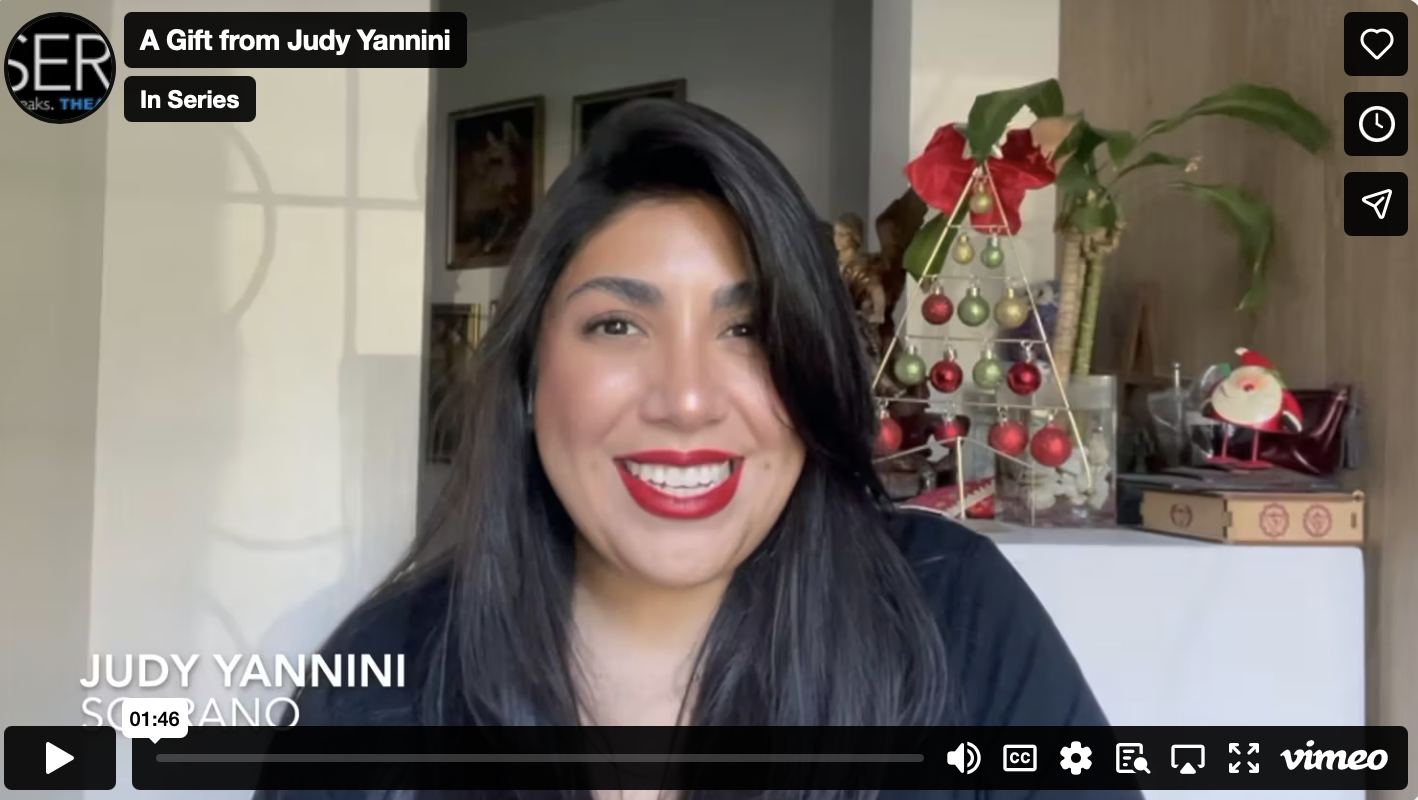 Today, we are serenaded by the luminous voice of soprano Judy Yannini, sharing the gentle holiday lullaby “A la nanita nana”. Judy, originally from Mexico, is a cherished member of the IN Series family, known for bringing heart, depth, and stunning voice to every role she embodies—from Mimi in Boheme in the Heights, to her powerful presence in I Was Looking at the Ceiling and Then I Saw the Sky, to her most recent role in Poppea. We’re honored to welcome her back this coming spring in For Women Serving Time, a new work with IN Series that continues her tradition of giving voice to stories that matter. Judy’s performance is a reminder of the beauty in tenderness, the power of tradition, and the warmth of home.